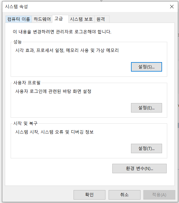 아래 부분에 환경 변수(N) 을 클릭해줍니다.