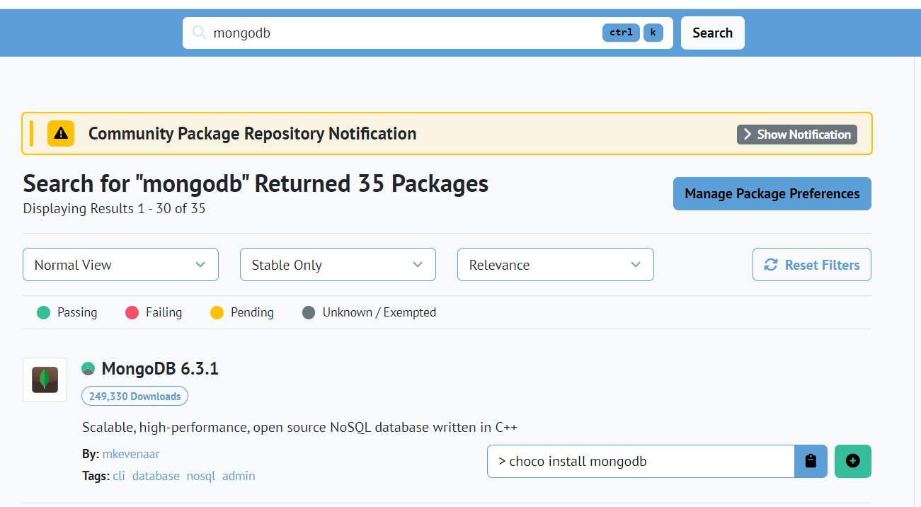 choco 홈페이지에서 mongoDB를 검색하면 아래와 같은 화면이 나온다.