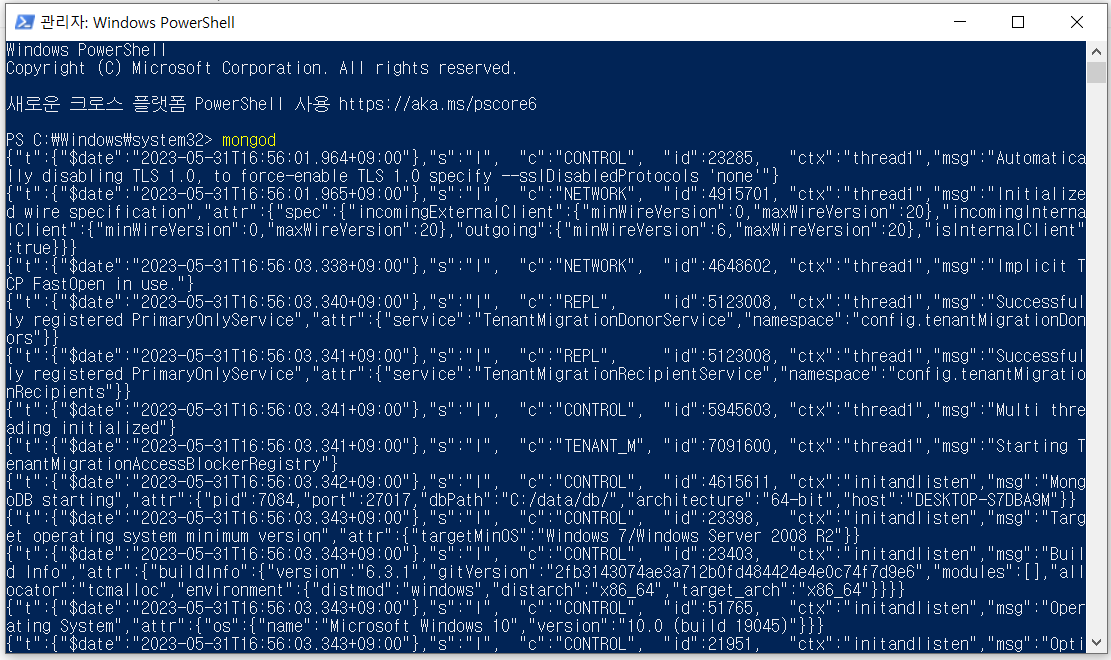 파워쉘 창을 관리자권한으로 들어가 mongod를 입력해주면 저렇게 알 수 없는 문자들이 나오게 됩니다.
