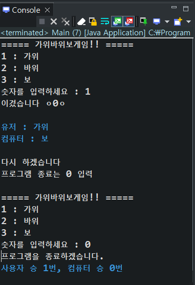 - 추가 : 만일 위내용을 쉽게 처리 했으면 프로그램 종료시 지금까지 전적을 출력