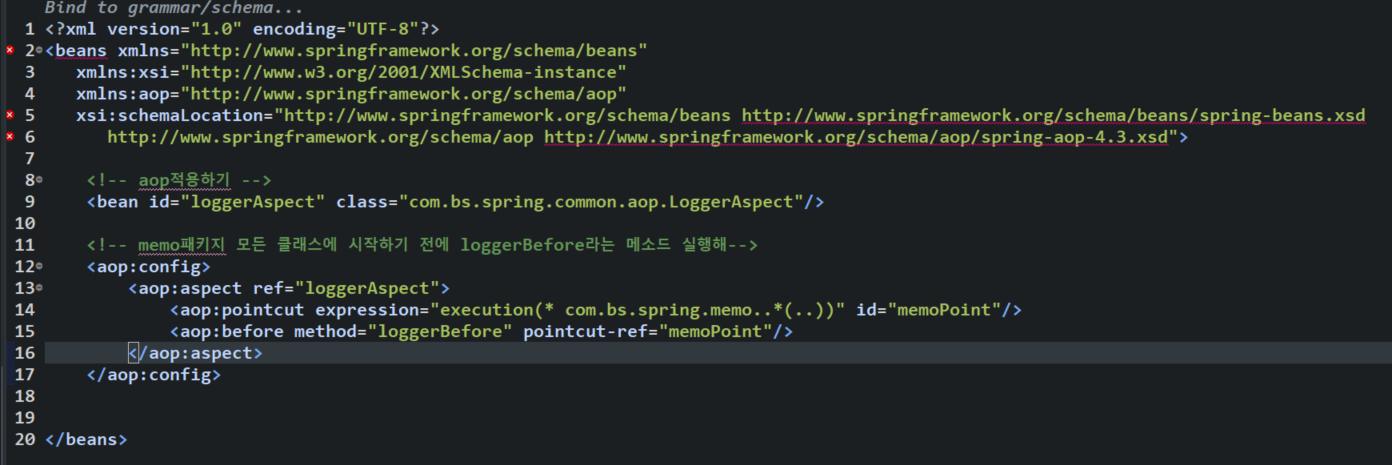 <aop:before 또는 <aop:after> 또는 <aop:around> …